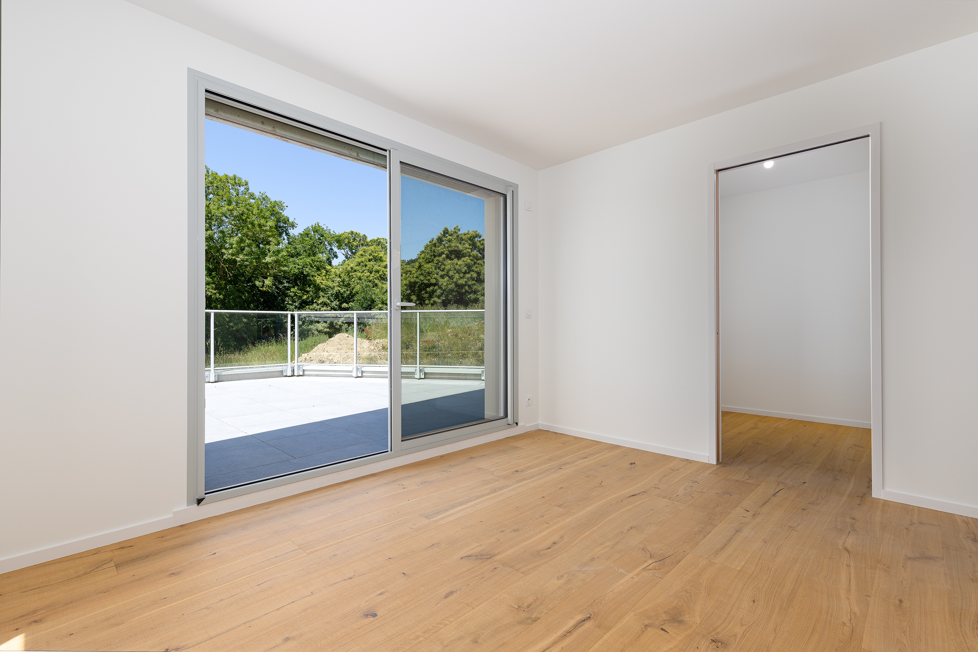 Avant : Extérieur très sur-exposé, sol terne, pièce du fond sombre
